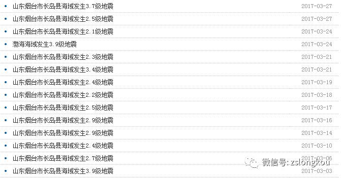 中國地震臺網正式測定:03月27日22時06分在山東煙臺市長島縣海域(北緯38.11度,東經120.79度)發生3.7級地震,震源深度9千米。數十位龍口市微友向我們爆料表示震感明顯。 山東省地震局統計 本月龍口市周邊已經發生14次地震
