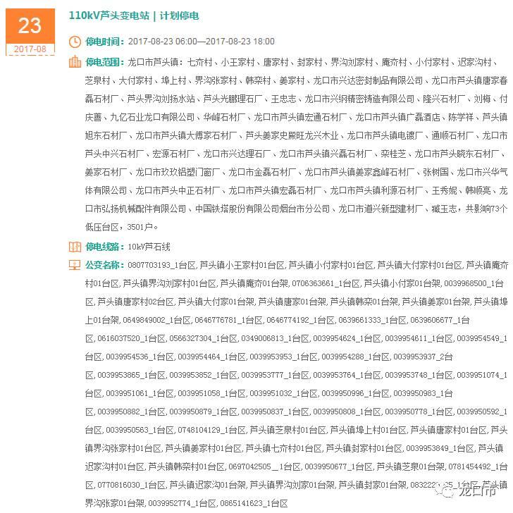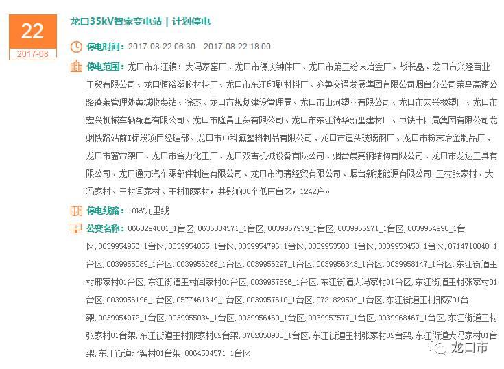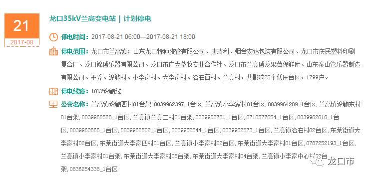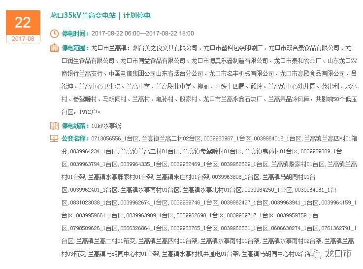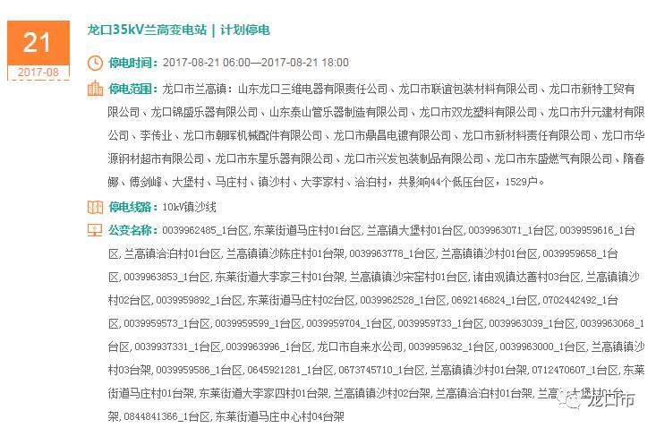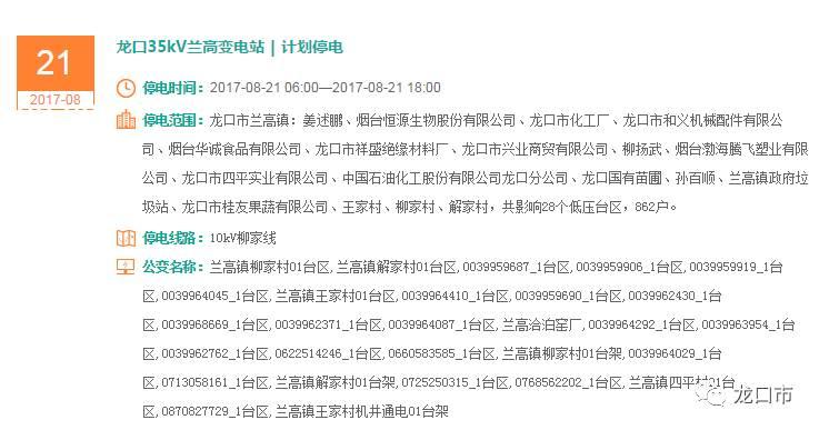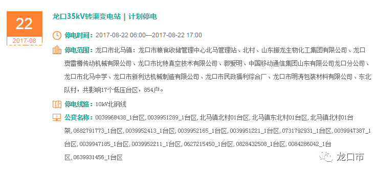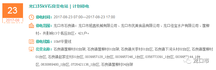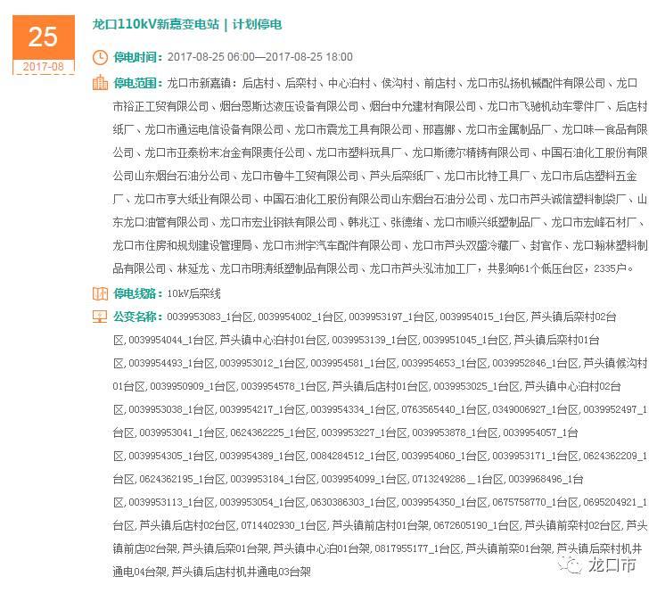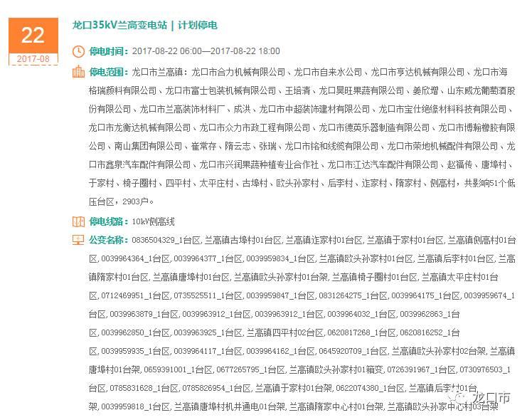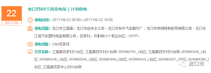 龍口市8月份這么多地方都要停電!快看看是哪天是你家!