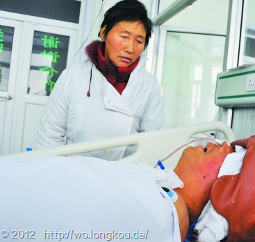 12月25日,記者在北海醫院重癥監護室的病床上見到了被打的環衛工人周玉樂師傅。周師傅面無表情,顯得十分憔悴。據他的女兒介紹,自從被打住院后,老人一直處于昏迷狀態。探訪期間醫生叮囑記者,病人身體非常虛弱 ,談話需盡量壓低聲音 ,以免影響他的身體恢復。
