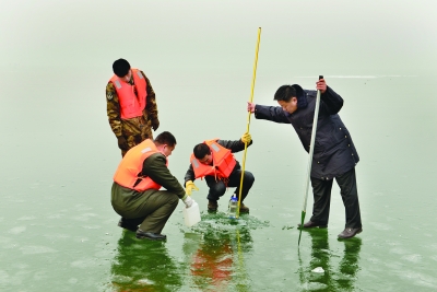破冰小組工作人員配備救生衣、棉水鞋、棉手套等防護設施,每天冒著嚴寒行走在隨時可能塌陷的冰面上,用簡易的木制工具在溢洪閘前方、放水洞周圍砸出一條條隔離帶,一干就是三、四個小時,有效消減冰推造成的破壞,保證工程安全、冬汛安全和供水安全。